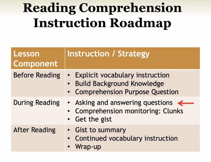 - lesson components – before, during, after reading – asking and answering questions, comprehension monitoring – clunks, get the gist
