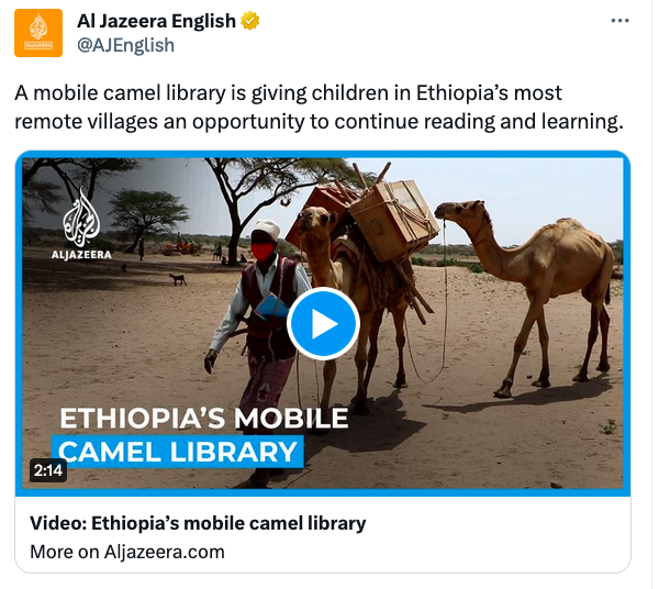 A mobile camel library is giving children in Ethiopia’s most remote villages an opportunity to continue reading and learning. pic.twitter.com/KwajtFIA3R